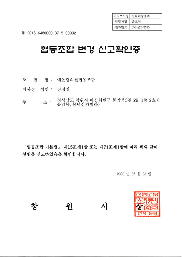• 협동조합 변경 신고확인증